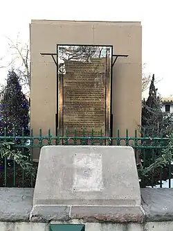 In February 2021, another person was arrested and charged with criminal damage to property. In June 2021, a man was arrested after climbing a box covering the pedestal and damaging part of it.[68][69] Also that June, a local fraternal order, the Union Protectíva de Santa Fé, filed a lawsuit against the Santa Fe city government after the city announced plans to remove it permanently.[70] As of 2022, eight people had been charged for destroying the obelisk,[71] and all but one has participated in community/restorative justice programs in exchange for charges being dropped.[72] Testimony in a civil lawsuit over the obelisk's removal began in September 2024.[73] In October, the city councel and mayor formed a committee to investigate the feasibility of removing the offensive plaque and moving the monument to Santa Fe National Cemetery.[74] That December, a judge ordered the Santa Fe government to remove the plywood around the obelisk within 30 days and to either restore the obelisk to its pre-2020 condition within 180 days or take no further action which does not comply with the New Mexico Prehistoric and Historic Sites Preservation Act.[75][76][77] If the obelisk were not restored, the Santa Fe government was required to instead initiate a historic review process.[78] The plywood box surrounding the base was removed on January 14, 2025.[79]