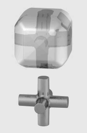 Because CAD programs running on computers "understand" the true geometry comprising complex shapes, many attributes of/for a 3‑D solid, such as its center of gravity, volume, and mass, can be quickly calculated. For instance, the cube with rounded edges shown at the top of this article measures 8.4 mm from flat to flat. Despite its many radii and the shallow pyramid on each of its six faces, its properties are readily calculated for the designer, as shown in the screenshot at right.