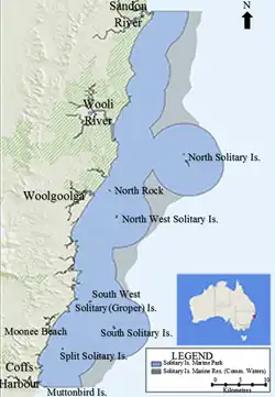 - ^ a b c NSW Marine Parks Authority. (2011). Solitary Island Marine Park & Solitary Islands Marine Reserve (Commonwealth Waters) - zoning summary and user guide. Retrieved 20/05/2015, from http://www.environment.gov.au/system/files/resources/8f451416-4b49-4eac-8287-4153281f2ae5/files/solitary-user-guide-map.pdf.