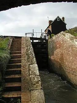 Somerton was farmed in an open field system of four fields until William Fermor secured an inclosure act from Parliament in 1765, the Somerton Inclosure Act 1765 (5 Geo. 3. c. 83 Pr.).[4] Thereafter Somerton's population grew, reaching 400 in the 1821 census. The stretch of the Oxford Canal between Banbury and Tackley was completed in 1787.[13] It runs along the Cherwell valley, and at Somerton it passes between the river and the village. Somerton Deep Lock was built 2⁄5 mile (1 km) north of the village.