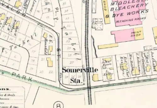 A short-lived station opened at Kent Street in 1842.[1][2][3]: 81  By 1851, Somerville station was located 0.2 miles (0.32 km) to the east at Park Street, near the junction of the Harvard Branch Railroad.[4][5] The station building was located on the north side of the tracks, just west of Park Street.[6][7] Like Union Square and other local stops, Somerville was served primarily by Lexington Branch trains in the mid-19th century.[8]