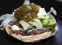 The masa base is fried with pinched sides and topped with refried beans, crumbled cheese, lettuce, onions, red or green sauce and sour cream. Sometimes other ingredients (mostly meat) are also added to create different tastes and styles.
