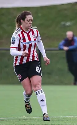 Jones then played for Sheffield United.[2] The team was in the first division for the first time for the 2018–2019 season.[8] The team's first win of the season was against Aston Villa, where Jones contributed 3 goals in their 4–1 victory.[8] In December 2018, her team played Millwall Lionesses in a FA Women's Championship match. Jones scored the only goal in her team's 1–1 draw ten minutes into the second half.[9] In another match in December 2018, her team lost 5–1 to Aston Villa. Jones scored the only goal of the game on a penalty kick.[10]