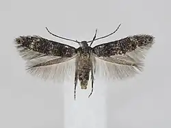 The wingspan is about 9–10 mm. The head is fuscous, whitish sprinkled. Forewings are fuscous, sometimes somewhat ochreous mixed; large blackish scale-tufts on fold at 1/4, on dorsum before tornus, below middle of costa, and in disc at 3/4; some raised black strigulae towards apex. Hindwings are grey. The larva is greenish; head and plate of 2 black. [2] [3]