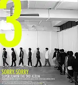 Sorry, Sorry is the third studio album by South Korean boy band Super Junior, released on March 12, 2009, in South Korea.[1] Sorry, Sorry was a critically and commercially successful hit in Asia, becoming 2009's best-selling Korean-language album in South Korea, Taiwan, Thailand, China, and the Philippines.[2][3] In less than a week after pre-orders were announced, over 150,000 copies were pre-ordered.[4] According to South Korea's Hanteo Charts, it debuted at 1st on the charts with almost 30,000 copies sold on the first day.[5] The album won a Disk Daesang (Album of the Year) at the 2009 Golden Disk Awards. Sorry, Sorry became the last album to feature the group's full 13 member lineup, with Han Geng departing by the end of the year, while Kangin and Kibum would begin a hiatus period before the next album.
