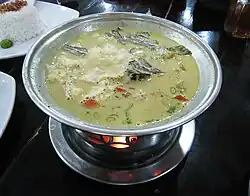 Another scholar suggests that it was more likely a mixture of cooking traditions in the region, namely Chinese, Indian, and native Indonesian cuisine.[10] There are traces of Chinese influence such as the use of bihun (rice vermicelli) and the preference for fried garlic as a condiment, while the use of turmeric suggests Indian influence. Another example is soto betawi from Jakarta uses minyak samin (ghee), which indicates Arab or Muslim Indian influences.[11] Another historian suggest that some soto recipe reflects the past condition of its people. Soto tangkar, which today is a meat soup, was mostly made from the broth of goat rib-cage bones (Betawi:tangkar) in the past because meat was expensive, or the common population of Batavia were too poor to afford some meat back then.[12] Soto recipes has been highly localized according to local tradition and available ingredients, for example in Hindu-majority island of Bali, soto babi (pork soto) can be found, since Hindu Balinese prefer pork while beef is seldom consumed, they also do not share Indonesian Muslim halal dietary law that forbids the consumption of pork.