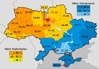 Results of the second round of presidential elections in Ukraine in 2004. Regions in which the majority of the votes scored Viktor Yanukovych (marked in blue), the initiators of the project was supposed to combine as part of South-East Ukrainian Autonomous Republic (PSUAR).