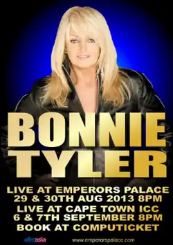 - ^ "Bonnie Tyler to rock Cape Town". Channel 24. 11 August 2013. Retrieved 5 September 2013.