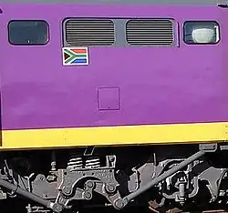 The whole series was delivered in the SAR Gulf Red livery with signal red cowcatchers, yellow whiskers and with the number plates on the sides mounted on three-stripe yellow wings. In the 1990s many of the Series 6 units began to be repainted in the Spoornet orange livery with a yellow and blue chevron pattern on the cowcatchers. Several later received the Spoornet maroon livery. In the late 1990s at least two were repainted in the Spoornet blue livery with outline numbers on the sides. In the Passenger Rail Agency of South Africa (PRASA) era after 2008, at least one was repainted in the Shosholoza Meyl purple livery.[8]