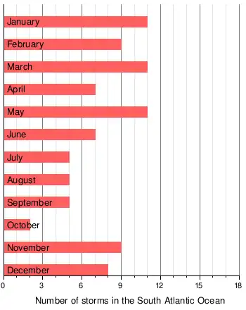 At the Sixth WMO International Workshop on Tropical Cyclones (IWTC-VI) in 2006, it was questioned if any subtropical or tropical cyclones had developed within the South Atlantic before Catarina.[7] It was noted that suspect systems had developed in January 1970, March 1994, January 2004, March 2004, May 2004, February 2006, and March 2006.[7] It was also suggested that an effort should be made to locate any possible systems using satellite imagery and synoptic data; however, it was noted that this effort may be hindered by the lack of any geostationary imagery over the basin before 1966.[7] A study was subsequently performed and published during 2012, which concluded that there had been 63 subtropical cyclones in the Southern Atlantic between 1957 and 2007.[8] During January 2009, a subtropical storm developed in the basin, and in March 2010, a tropical storm developed, which was named Anita by the Brazilian public and private weather services.[9][10] In 2011, the Brazilian Navy Hydrographic Center started to assign names to tropical and subtropical cyclones that develop within its area of responsibility, to the west of 20°W, when they have sustained wind speeds of at least 65 km/h (40 mph).[11]