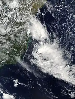 On 21 January 2020, the Brazilian Navy Hydrographic Center began monitoring an area of persisting thunderstorms near São Paulo for potential subtropical cyclone development. Generally tracking southeastward, the system began to organize within the afternoon of 22 January, aided by the establishment of a South Atlantic Convergence Zone, and was designated a subtropical depression early on 23 January.[64] Several hours later, due to a lack of wind shear, the system intensified into a subtropical storm and was given the name Kurumí.[65] After this bout of intensification, Kurumí moved southward and began to succumb to much more unfavorable conditions. It weakened back to a subtropical depression on late 24 January, due to an intensification of wind shear over its circulation due to the formation of an extratropical cyclone to its southeast.[64][66] The last advisory was issued on Kurumí later that same day, as it degenerated into a trough while also beginning to merge with the nearby frontal system.[64]