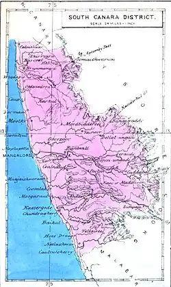 South Canara (South Kannada) was a district of the Madras Presidency of British India, located at 13°00′N 75°24′E / 13.00°N 75.40°E / 13.00; 75.40.[2] It comprised the towns of Kassergode and Udipi and adjacent villages, with the administration at Mangalore city. South Canara was one of the most heterogeneous areas of Madras Presidency, with Tulu, Malayalam, Kannada, Konkani, Marathi, Hindustani, and Beary languages being spoken. It was succeeded by the Tulu-speaking areas of Dakshina Kannada district,[3] the Malayalam-speaking area of Kasaragod district[4] and the Amindivi islands sub-division of the Laccadives,[5] in the year 1956.[6][7][8]