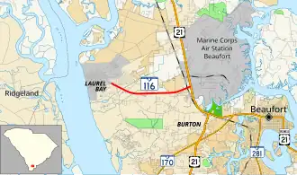 South Carolina Highway 116 (SC 116) is a 3.400-mile-long (5.472 km) state highway located entirely within Beaufort County, South Carolina, in the southern part of the U.S. state of South Carolina. Also known locally as Laurel Bay Road, SC 116 connects the Laurel Bay military housing development with the Marine Corps Air Station Beaufort (MCAS Beaufort) facility.