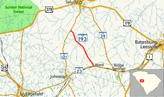 South Carolina Highway 193 (SC 193) is a 6.930-mile-long (11.153 km) state highway in the U.S. state of South Carolina. The highway connects Ward and rural areas of Saluda County.