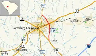 South Carolina Highway 245 (SC 245) is a 5.060-mile-long (8.143 km) state highway in the U.S. state of South Carolina. The highway was built and paved in 1932 as a short spur of SC 24 passing north through Leesville to connect with SC 391.[2] Since being built, that section of SC 24 was redesignated as US 178 in 1933, and Leesville merged in 1992 with Batesburg, where US 1 and SC 391 intersect, to form the town of Batesburg-Leesville. It is known locally as North Lee Street north of the railroad tracks, and as South Lee Street south of the railroad tracks. There are two traffic lights along SC 245.[3]
