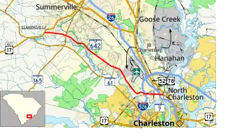 SR 642 runs for 19.3 miles (31.1 km) from U.S. Route 17 Alternate (US 17 Alt.) southwest of Summerville to US 52/US 78 in North Charleston.[3] Dorchester Road is a heavily congested highway during morning and evening traffic periods.