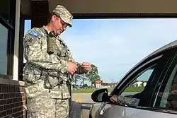 Cpl. Paul Herring, a security augmentee assigned to the 3rd Battalion, 1st Brigade of the South Carolina State Guard, guarding the front gate at McCrady Training Center, S.C.