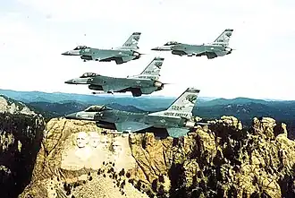 ![]() Four-ship F-16 formation of the 175th Fighter Squadron "Lobos" from Sioux Falls AGB over Mount Rushmore. The 175th is the oldest unit in the South Dakota Air National Guard, having over 60 years of service to the state and nation. | |