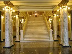 In anticipation of South Dakota's state centennial during 1989, the building was renovated extensively and restored during the administrations of Governors Richard F. Kneip, Harvey L. Wollman, Bill Janklow, and George S. Mickelson. The renovation required 22 years and restored much of the building and its decoration, including the tile floor, to its original appearance.[2] The tiled floor was also repaired; each of the tile workers who did the repairs is said to have been given a heart-shaped stone with which to mark the new floor, as the original workers had.[15] Work began in 2013 to restore stained glass throughout the building with the $2.7 million project concluded in time for South Dakota's 125th Anniversary celebrations October 1.[16]
