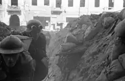 Soldiers of the Home Army in the partisan barricade, located between 22 and 27 Jerusalem Avenue, during the Warsaw Uprising, in September 1944.