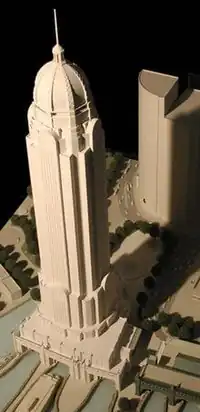 The South Ferry Plaza, also called A Lighthouse At The Tip Of The Island,[1] was a supertall skyscraper proposed in 1987[3][4] to rise right next to the East River on Manhattan Island in New York City.[2] The building would have sat on top of the South Ferry terminal and tower 1,084 ft (330 m) above street level, with 60 stories of office space.[1] It was designed by architect Fox & Fowle Architects and Leslie E. Robertson Associates.[2] The architects designed the building for office use and the skyscraper incorporated recycled marble and steel with glass in its structure. The architectural plan had a glass dome that was supposed to be lit at night, which also contained an observation deck and three restaurants located inside the dome.[1] In addition, the project called for the renovation of the South Ferry Terminal, including the train station so it can accommodate 100,000 people. The project would have doubled the size of Battery Park if it had proceeded, since the building included a plaza that was planned to tie in with Battery Park via a new promenade at the tip of Manhattan.[1] The project was canceled in 1991 because of a lack of funding.[5]