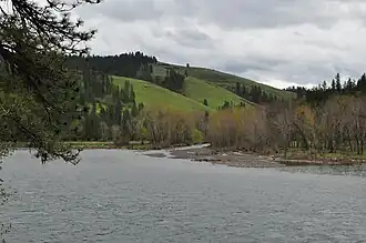 The river is formed by the confluence of the American River and Red River in the Nez Perce National Forest at an elevation of 3,901 ft (1,189 m). The roughly 20-mile (32 km) American River rises at 5,200 ft (1,600 m) and flows generally south to the confluence, while the northwest flowing Red River, rising at 6,100 ft (1,900 m), is about 25 mi (40 km) long. The American River is sometimes considered part of the main stem.[1] From the confluence the South Fork flows west through a canyon followed by Idaho State Highway 14, receiving the Crooked River from the left and Newsome Creek from the right before reaching Golden, where it receives Tenmile Creek from the left. Further west the river receives Johns Creek from the left, Meadow Creek from the right and Mill Creek from the left, and the gorge deepens to a maximum of some 2,000 ft (610 m) as the river swings north near Grangeville. From there the river flows generally north, past Harpster and Stites, before reaching its mouth on the Clearwater at Kooskia, at an elevation of 1,224 ft (373 m).[2]