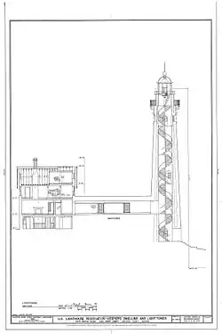 The increased shipping traffic brought changes and in 1871, a 100-foot tower was built. The tower is 18 feet in diameter at the base. The walls are hollow and 5 feet thick at the base tapering to 3 feet thick at the top. A passageway was added connecting the tower to the keeper's dwelling. A Third Order Fresnel lens from Paris was installed with a 3-wick lamp that had a range of 18 miles. In 1875, the first steam fog signal on Lake Michigan was installed replacing the fog bell.[5] The 100 foot lighthouse was in operation from 1871 to 1958. The lighthouse is still in good condition. Recent efforts have restored its light tower to operational status for the summer months.