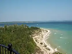 This is the third lighthouse built on the island. Construction of the first began in 1839 and the 1-1/2-story lighthouse with a lens in the cupola first went on in 1840, under the care of Lighthouse keeper William N. Burton, who had a thriving lumbering business.[2] It had a Lewis lamp, which was upgraded to a fourth order Fresnel lens /frˈnɛl/. Deterioration of the building led to the lighthouse being completely rebuilt in 1858. Over time this light was found to be deficient, and the current lighthouse was built in 1872. With a third order Fresnel lens sitting 91 feet (28 m) above the foundation, this light boasted a focal plane of 104 feet (32 m).[3] The site is under the control of the National Park Service, in conjunction with the Sleeping Bear Dunes National Lakeshore.[4] It is listed in the National Register of Historic Places.[5] The lighthouse was decommissioned in 1958, and is now a museum. It is not operational.[6]