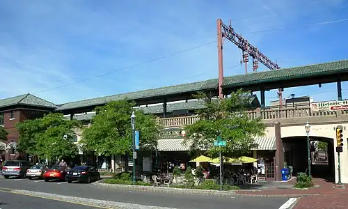 The western end of the platform for tracks 1 and 3 and the eastern end of the platform for track 2 contain high-level sections of platform. Installed in 2004, these allow those with handicaps to board and bring the station in compliance with ADA regulations.[9] There are a number of retail stores at street level, below the station building. As of 2022, these stores are Cait & Abby's Bakery, Starbucks, Super Cuts, On the Track Cleaners, Cold Stone Creamery, and Village Diner.