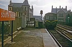 South Shields railway station served the town of South Shields, in Tyne and Wear, England. The station was located on Mile End Road in the town centre. It was opened by the North Eastern Railway in 1879,[1] as the terminus of their newly extended Newcastle and South Shields Railway branch from Pelaw, via Hebburn. It had two platforms and an ornate overall roof.