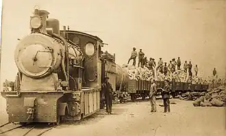 Eight-coupled Tender with auxiliary water tank wagon on a trainload of whale bones, Walvisbaai, c. 1925