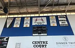 The Slammers' 5 SBL championship banners on display at Eaton Recreation Centre, 2019