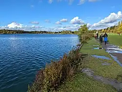 The Pennines in the west of the county are mostly inside the Peak District National Park and also contain carboniferous rocks, with the underlying geology primarily being millstone grit sandstones of the Dark Peak rising from the Yorkshire coalfield and the terrain is mostly moorland plateaus and gritstone edges.[17] The inner Pennine fringes between the Dark Peak and Yorkshire coalfield are distinguished by many steep valleys, and a transition from uplands and rural landscape to lowlands and urban landscape towards the east of the county.[18] Major rivers which cross the area are the Dearne, Rother and Don. To the east, in the Doncaster area the landscape becomes flatter as the eastward dipping carboniferous rocks of the coalfield are overlain by the lacustrine deposits of the Humberhead Levels.[19]