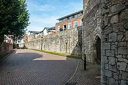 Little remains of the eastern walls, but in the north-east corner several towers still remain largely intact, including Polymond tower, a powerful drum tower largely reconstructed during the Victorian period.[70] Further west is the Bargate; this was originally a simple archway but was expanded with drum towers and arrow slits in the early 14th century, and then expanded again in the early 15th century with battlements and parapets, before being heavily restored in the 19th century.[71] The Bargate remains an elaborate building, taking military symbolism and combining it with rich civic heraldry and decoration above the gateway.[72]