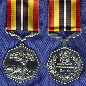 The Southern Africa Medal is an octagonal medallion struck in nickel silver, 3 millimetres thick, to fit in a circle 38 millimetres in diameter. It depicts a cheetah walking past a thorn tree. As a matter of interest, the cheetah depicted on the medal was copied by the medal designer, State Herald Fred Brownell, from the definitive issue 10c postage stamp which was issued in South West Africa on 1 October 1980.[1]