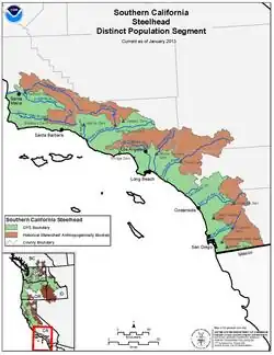The Southern California Steelhead Distinct Population Segment (DPS) occurs from the Santa Maria River to the Tijuana River at the United States and Mexican Border in seasonally accessible rivers and streams.[1] Steelhead (Oncorhynchus mykiss) in the Southern California Steelhead DPS, much like its relatives further north, requires sufficient flows in their natal streams to be able to return from oceans and lakes to spawn. Due to the extended periods of drought throughout their range, Southern California steelhead are most commonly seen during periods of increased rainfall, such as El Niño events.[2] Declared federally endangered in 1997,[3] the geographic range of the DPS when first listed extended from the Santa Maria River south to Malibu Creek. In 2002 steelhead were discovered in San Mateo Creek on the county line of Orange and San Diego counties. With this discovery the range of the DPS was extended to include Los Angeles, Orange, and San Diego counties. [4]