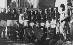 The first match as the actual Soviet Union football team took place a year later, a 3–0 win over Turkey. This and a return match in Ankara were the only officially recognised international matches played by the Soviet Union prior to the 1952 Summer Olympics, though several unofficial friendlies against Turkey took place in the 1930s. The 1952 Olympics was the first competitive tournament entered by the Soviet Union. In the preliminary round, Bulgaria were defeated 2–1, earning a first-round tie against Yugoslavia. Before the match, both Tito and Stalin sent telegrams to their national teams, which showed just how important it was for the two heads of state.[8] Yugoslavia led 5–1, but a Soviet comeback in the last 15 minutes resulted in a 5–5 draw. The match was replayed, Yugoslavia winning 3–1.[9] The defeat to the archrivals hit Soviet football hard, and after just three games played in the season, CSKA Moscow, who had made up most of the USSR squad, was forced to withdraw from the league and later disbanded. Furthermore, Boris Arkadiev, who coached both USSR and CSKA, was stripped of his Merited Master of Sports of the USSR title.[8]