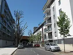 Newer buildings at the eastern end of the street near the railway viaduct.