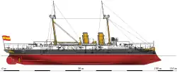 Reina Regente was the lead ship of the Reina Regente-class protected cruisers. She had an iron hull. She displaced either 4,664[1] or 4,725[2] tons, according to different sources. She was 97.30 metres (319 ft 3 in) long, 15.43 metres (50 ft 7 in) in beam, 8.92 metres (29 ft 3 in) in height, and 5.90 metres (19 ft 4 in) in draft.[1] She had two Thompson horizontal triple expansion steam engines and four cylindrical boilers that produced a nominal 11,598 horsepower (8,649 kW), driving two screws. She reached 20.4 knots (37.8 km/h; 23.5 mph) under forced draft and on sea trials achieved 18.6 knots (34.4 km/h; 21.4 mph) under natural draft.[1][2] She could carry up to 1,285 tons of coal and had a range of 12,000 nautical miles (22,000 km; 14,000 mi) at her economical cruising speed.[1]