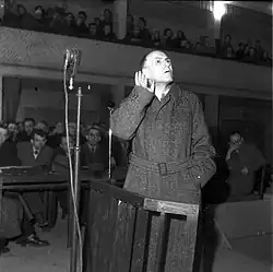 "People's Tribunals" had been taking place since December 1944, but the most notorious was the Special Court of Tirana.[7] The Special Court started in Tirana on 1 March 1945, and lasted until April 13 1945. The sessions took place in the premises of former "Savoja" cinema (renamed later to "Kosova" cinema, today's Albanian National Theater building). During this time it held 31 session and trialed 60 persons.[8] General Lieutenant Koçi Xoxe was the leading judge, while General Major Bedri Spahiu was the prosecutor. The jury had 9 members,[2] others were Beqir Balluku, Medar Shtylla (Minister of Economy), Faik Shehu, Halim Budo, Gaqo Floqi, Hysni Kapo, Bilbil Klosi, Gjon Banushi.[9][4]