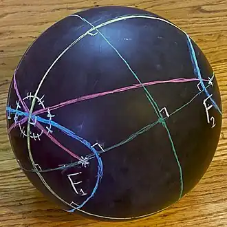 In mathematics, a spherical conic or sphero-conic is a curve on the sphere, the intersection of the sphere with a concentric elliptic cone. It is the spherical analog of a conic section (ellipse, parabola, or hyperbola) in the plane, and as in the planar case, a spherical conic can be defined as the locus of points the sum or difference of whose great-circle distances to two foci is constant.[1] By taking the antipodal point to one focus, every spherical ellipse is also a spherical hyperbola, and vice versa. As a space curve, a spherical conic is a quartic, though its orthogonal projections in three principal axes are planar conics. Like planar conics, spherical conics also satisfy a "reflection property": the great-circle arcs from the two foci to any point on the conic have the tangent and normal to the conic at that point as their angle bisectors.