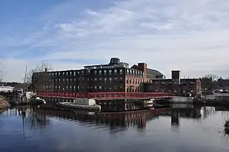 The Spicket Falls Historic District encompasses the historic industrial and commercial heart of Methuen, Massachusetts, and one of the lower Merrimack River's best-preserved 19th century mill complexes. It is centered on the falls of the Spicket River, from which the 19th century textile mills of Methuen derived their power. The historic district, listed on the National Register of Historic Places in 1984, includes commercial and civic buildings in and near Gaunt Square, the heart of the city, and along both sides of the Spicket River between Gaunt Square and the Boston and Maine Railroad tracks south of the river. It abuts the residential Pleasant-High Historic District, which lies to its east.[2]
