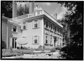 The Spite House stands on the east side of Deadman's Point, the easternmost projection of the peninsula which separates Rockport Harbor from Penobscot Bay. It is a large two-story wood-frame structure with a central hip-roofed main section flanked by wings extending to the north and south. The walls are finished in wooden clapboards, and the building rests on original granite slabs set on a 1925 concrete foundation. The roof is pierced by four tall brick chimneys, each with a band of corbelling near the top. The roof is encircled by a balustrade, and has an octagonal cupola at its center, also topped by a balustrade. The main facade is five bays wide, with simple corner trim rising to a plain entablature and modillioned cornice. Windows are sash with shutters and there are decorative panels between the floors. The main entrance is framed by pilasters and topped by a half-round window and deep cornice supported by scrolled brackets.[2]