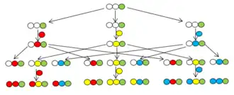 The String Synthesis introduced by Furka et al.[28] uses stringed macroscopic solid support units (crowns) and the units are identified by their position occupied on the string. One string is assigned for every building block in the synthesis. In the coupling stage, the string is in the proper reaction vessel. The content of the strings coming out from a synthetic step must be redistributed into the strings of the next step. The units are not pooled. The redistribution demonstrated in the figure follows the combinatorial distribution rule: all products formed in a synthetic step are equally divided among all reaction vessels of the next synthetic step. Different distribution formats can be followed that allows the identification the content of each crown depending on the position on the new string and the destination reaction vessel of the string.[29]