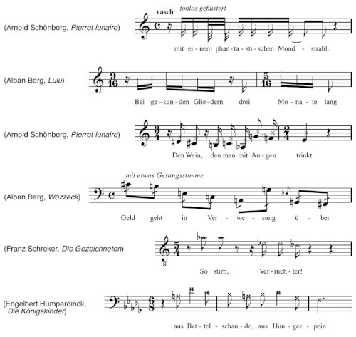 The earliest compositional use of the technique was in the first version of Engelbert Humperdinck's 1897 melodrama Königskinder (in the 1910 version it was replaced by conventional singing), where it may have been intended to imitate a style already in use by singers of lieder and popular song,[3] but it is more closely associated with the composers of the Second Viennese School. Arnold Schoenberg asks for the technique in a number of pieces: the part of the Speaker in Gurre-Lieder (1911) is written in his notation for Sprechstimme, but it was Pierrot lunaire (1912) where he used it throughout and left a note attempting to explain the technique. Alban Berg adopted the technique and asked for it in parts of his operas Wozzeck and Lulu.