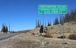 Spring Creek Pass, elevation 10,898 ft (3,322 m), is a mountain pass on the Continental Divide in the San Juan Mountains of Colorado. The pass is traversed by State Highway 149, and the Continental Divide Trail and Colorado Trail follow the divide and cross the highway here. Somewhat unusually for a pass on the Continental Divide, it is not the highest point on the highway in the vicinity; heading north from the pass, the road climbs over the considerably higher Slumgullion Summit before descending toward Lake City.