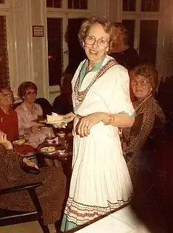 The squaw dress started out as a trend in the American Southwest in the 1940s and went nationwide in the 1950s.[21] The first designers of the squaw dress are unknown, however designers such as Dolores Gonzales and Cele Peterson were selling dresses they called "squaw Dresses" by 1948.[20] Bill and Elizabeth Macey who owned a clothing manufacturing plant called the Arizona Shirt Company, created a design for the squaw dress as well.[22] The Maceys' design was considered "smart," but authentic, according to The Arizona Republic.[23] George Fine who owned Georgie of Arizona was another major creator of the dresses.[13] Lloyd Kiva New, a Cherokee designer, also created squaw dresses.[24] Eventually J.C. Penney, Woolworth's and Neiman Marcus were selling versions of the squaw dress.[13] In 1954, Gimble's department store in Philadelphia held a fashion show where "Princess Red Rock" modeled the dress on the runway and the store sold versions of the dress.[25] Women such as Mamie Eisenhower, Pat Nixon, Cyd Charisse and Elsa Martinelli were seen in these dresses.[26][27]