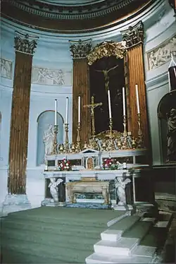 The exterior is unexceptional, but the interior is magnificent, with a long hall flanked with Corinthian columns, and niches with lifesize plaster statues of the Apostles and bas-reliefs of episodes in the life of Christ by Luigi Bozzoni of Carrara. The building is barrel-vaulted, ending in an apse behind the altar, which is of marble inset with panels of polished granite and porphyry. Plenty of 'faux' marbling and real gold leaf adds to the effect, and the acoustics are noteworthy.