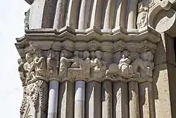 The main pointed-arch portal of the church is made of grey limestone. The capitals of the pillars, the outermost posts of the portal, the tympanum and the wimperg are all decorated with sculptures. The tympanum contains a depiction of the Coronation of the Virgin, accompanied by the apostles John, Peter and Paul as well as John the Baptist. The eastern band of capitals, partially damaged, depicts scenes from the life of Mary while the western depict scenes from the childhood of Christ.[20] The rectangular sides of the outer posts of the portal, facing south, are decorated with sculptures of four standing figures, probably saints. They are framed by aediculae. The wimperg, flanked by two pinnacles, contains a sculpture of the Resurrection of Jesus.[21]