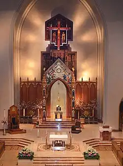 The Parish of St. Agnes was founded in 1887, when the first Mass was celebrated at Walter Johnson's blacksmith shop with an anvil as the altar. By 1890, the blacksmith shop could no longer accommodate the parishioners so a small group rented the Gildersleeve's Hall in the local Institute Building. Next, a former school building was used as a church. St. Agnes Parish was formally established by Bishop Charles Edward McDonnell of Brooklyn, in 1894.[2] In 1905, a white marble stone Church was built, to serve the Catholic population of Rockville Centre. Due to the increasing number of parishioners, the small marble church grew insufficient for the needs of the parish, so demolition began in 1933, under the direction of Msgr. Peter Quealy.